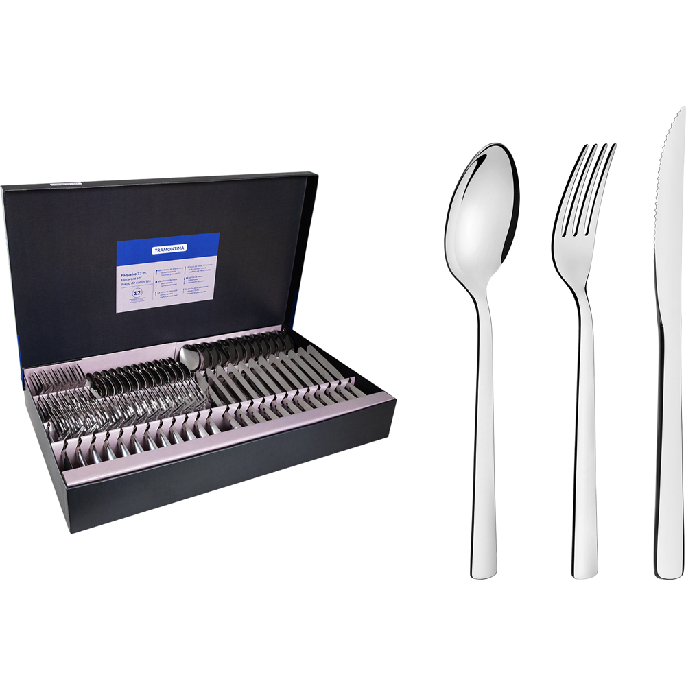 As peças são acondicionadas em uma bela embalagem. Totalmente feitas de aço inox, altamente duráveis, mantêm suas características originais, preservando a beleza, a higiene e a durabilidade do material. Colheres com bojo em formato simétrico e bordas cuidadosamente arredondadas. Garfos com dentes polidos na parte interna, com formato apropriado para a boca e bordas arredondadas para proporcionar maior conforto no uso. Facas totalmente temperadas, que garantem maior durabilidade no fio de corte e maior resistência à corrosão, e por suas características de temperabilidade, não riscam as porcelanas. Acabamento em brilho, com detalhes no cabo. Serviço para 12 pessoas. Podem ser lavadas diariamente na máquina de lavar louças.