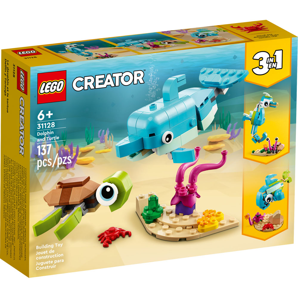 Os fãs de LEGO® a partir de 6 anos podem mergulhar até ao fundo do mar para desfrutar de aventuras com este conjunto de construção 3em1 Golfinho e Tartaruga (31128). Contém um golfinho bebê com corpo, barbatanas, boca e cauda ajustáveis, e uma tartaruga marinha bebê com nadadeiras e cabeça ajustáveis, ambos colocados em uma base de exposição.