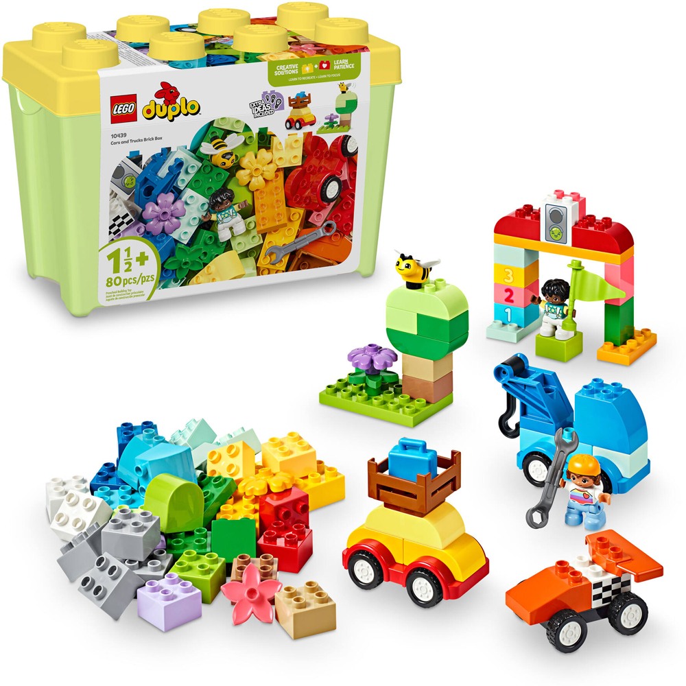 As crianças fãs de veículos desenvolvem capacidades criativas com o conjunto Caixa de Peças de Carros e Caminhões (10439). Com 3 bases de rodas e 80 peças, este conjunto de construção criativa permite que crianças a partir de 18 meses construam um carro de corrida com pódio, um caminhão-reboque, um carro de família, uma paisagem campestre ou qualquer coisa que imaginarem!