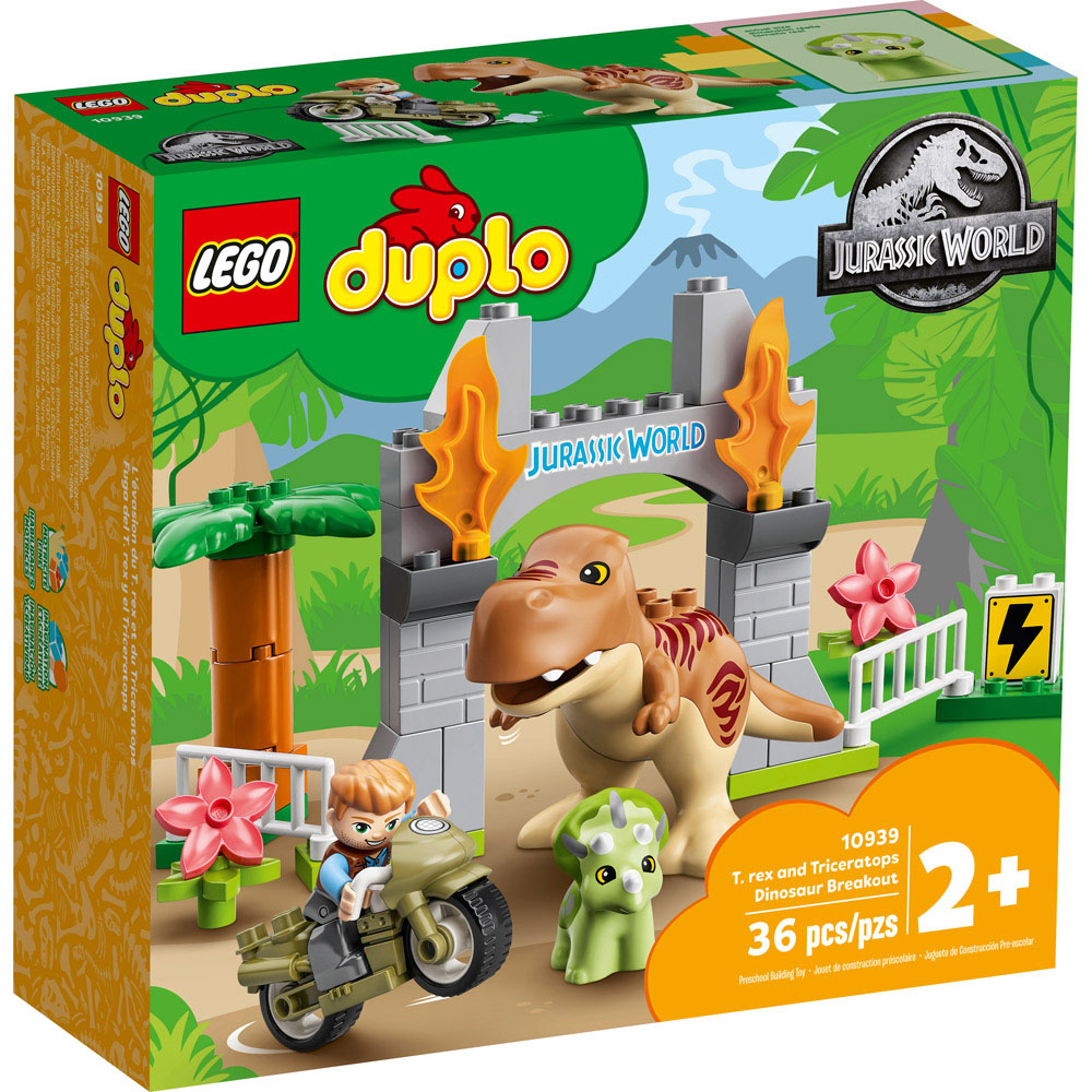 Este brinquedo LEGO® DUPLO® Jurassic World Fuga dos Dinossauros T. rex e Triceratops (10939) traz funcionalidades divertidas e ações do filme Jurassic World que vai fazer as crianças adorarem dinossauros.